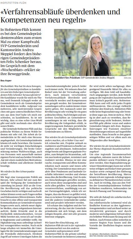 Am Sonntag, 26.9.21 finden die Wahlen für das Gemeindepräsidium in Hofstetten-Flüh statt. Die Wahlberechtigten haben die Wahl zwischen dem bisherigen Amtsinhaber Felix Schenker, und Andrea Meppiel als neue, junge Herausforderin.